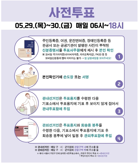 • 투표 시간: 사전투표는 오전 6시부터 오후 6시까지 진행됩니다. 마감 시간 직전에 도착하면 투표가 어려울 수 있으니 여유 있게 방문하세요.