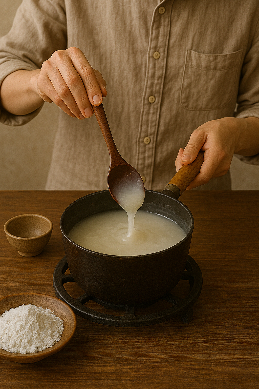 - 찹쌀가루 2스푼과 물 1컵을 넣고 약불에서 저어가며 찹쌀풀을 끓입니다.