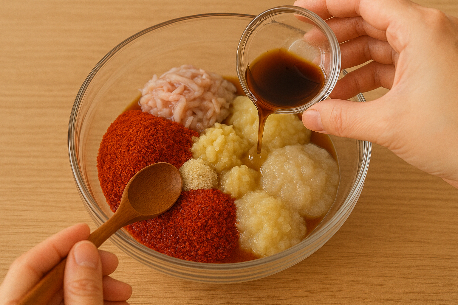 - 볼에 고춧가루, 멸치액젓, 새우젓, 다진 마늘, 생강, 설탕, 간 양파·사과, 찹쌀풀을 모두 넣고 잘 섞습니다.